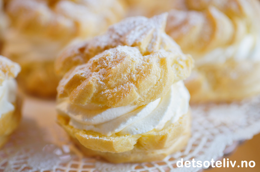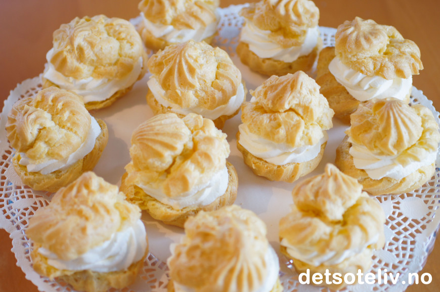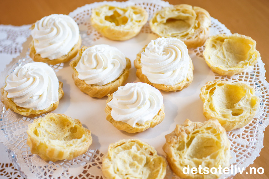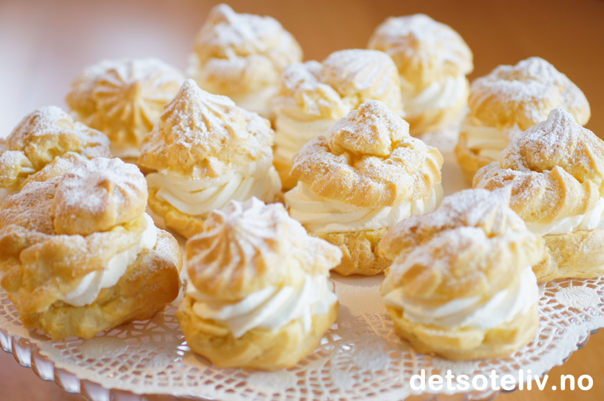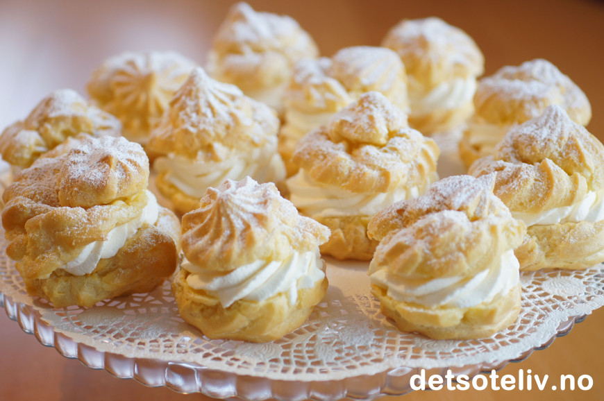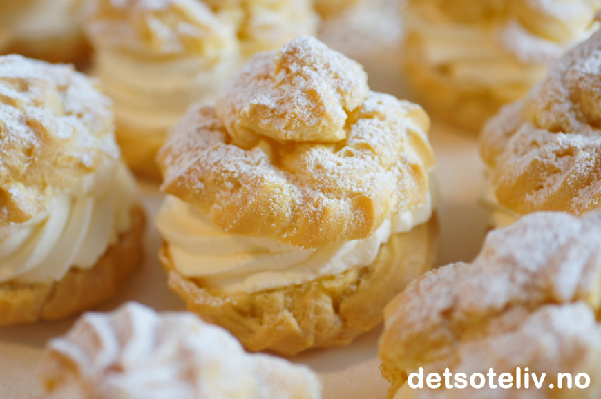 Dette er delikate vannbakkels som fylles med "crème chantilly", som bare er et lekkert, fransk navn på helt enkel søt, pisket krem. Bare et lett melisdryss på toppen understreker den elegante stilen.