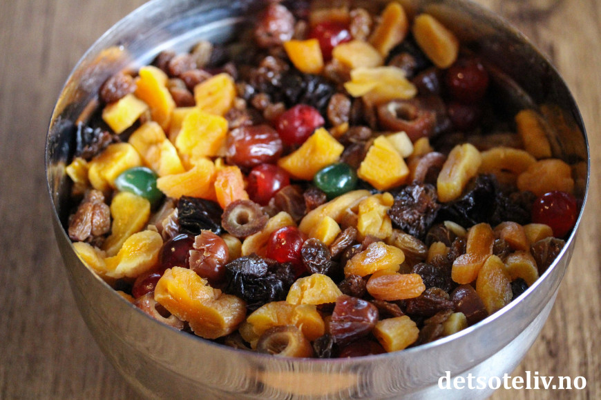 ♥ Du kan bruke den blandingen av tørket frukt som du ønsker, så denne kaken er utmerket å lage dersom du har diverse rester av tørket frukt liggende. Et forslag til fruktblanding som gir svært godt resultat er følgende: