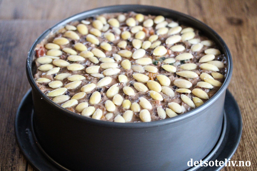 Ha deigen i en rund kakeform (24 cm i diameter) med bakepapir i bunnen. Jevn til overflaten. Legg skåldede mandler som er delt på midten i pent mønster oppå deigen. Stek kaken på rist midt i ovnen ved 140°C i 3 timer (se tips).