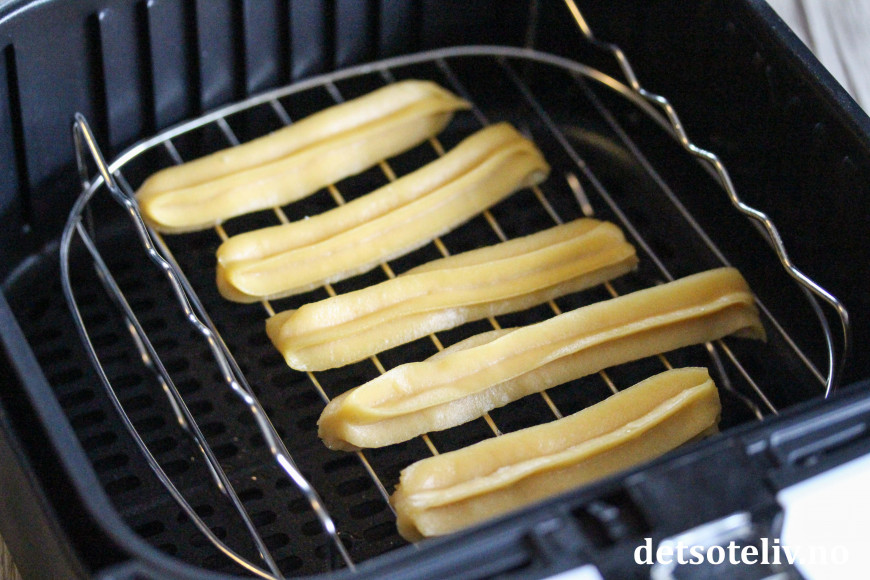 Stek Churros i airfryeren til de er gylne og sprø på utsiden, men fortsatt luftige og myke inni.