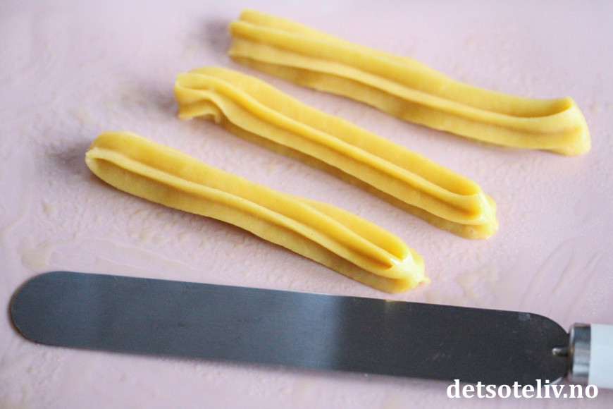 Ha deigen i en sprøytepose (se tips) og sprøyt ut ca. 10 cm lange stenger på silikonmatten. Bruk en saks (lett sprayet med formfett) for å klippe stengene fra sprøyteposen.