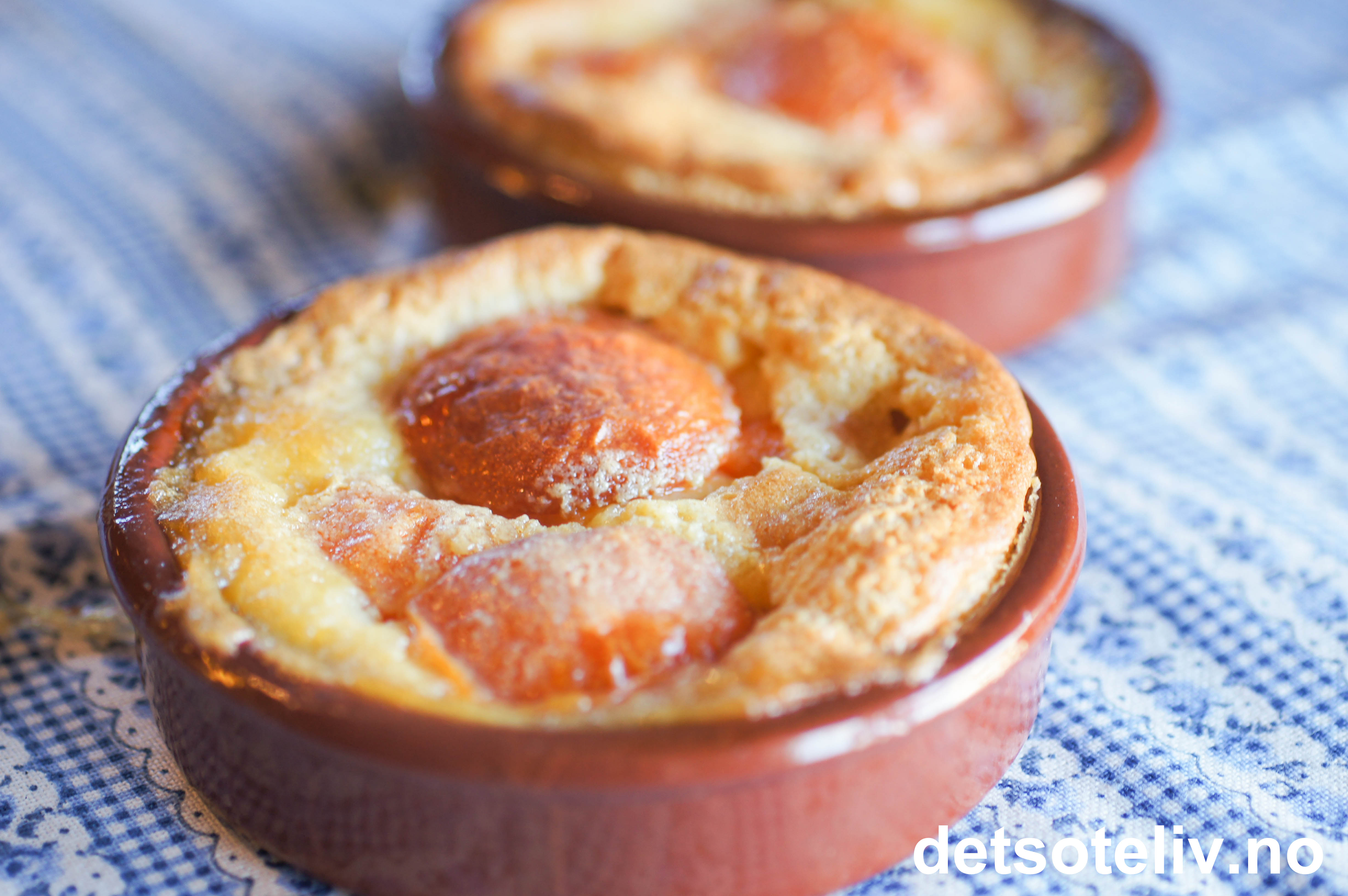 Del aprikosene og fjern stenene. Legg de med snittflaten ned i formen. Du kan enten bruke 4 porsjonsformer eller en stor, rund form.