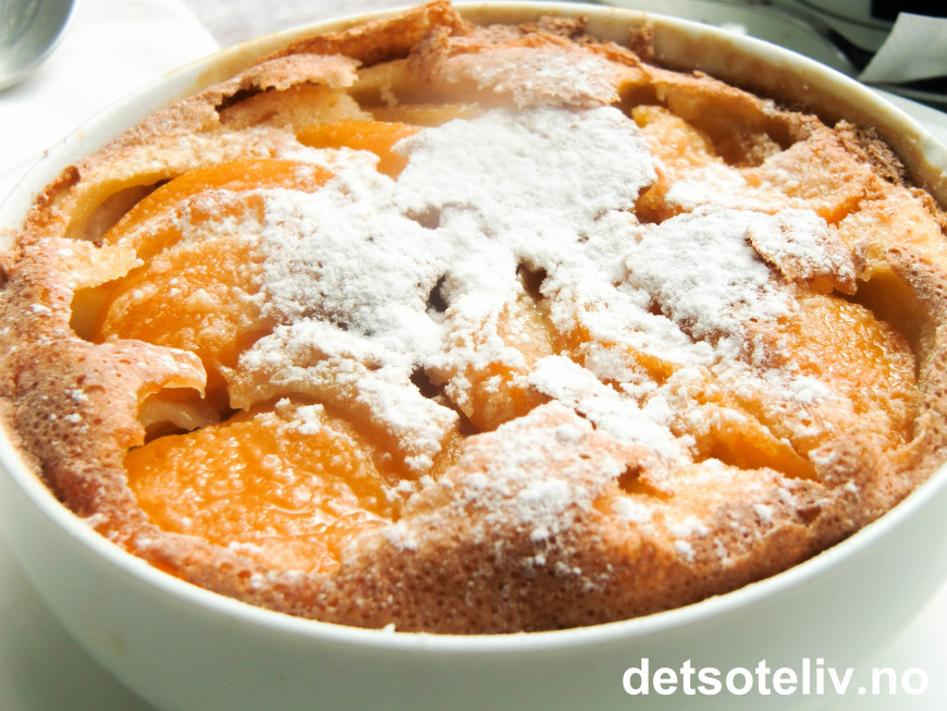 Pisk egg og sukker lett sammen med en visp. Bland i hvetemel, vaniljesukker, melk og smeltet smør til en jevn og klumpfri røre. Hell røren over aprikosene i formen.