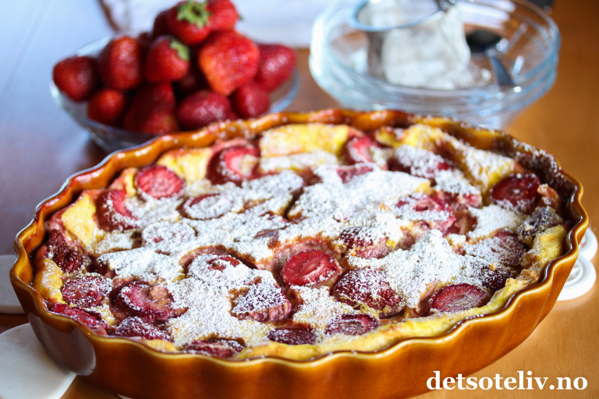 En klassisk "Clafoutis" lages vanligvis med kirsebær eller moreller (se tidligere registrert oppskrift her på detsoteliv.no). Bruker man andre bær eller frukter, heter kaken egentlig "Flaugnarde", men disse titlene blandes ofte sammen i praksis. Uansett; her har du en nydelig jordbærvariant av denne herlige, berømte, franske dessertkaken - og vil du briefe, kan du jo fortelle dine gjester at du serverer dem en "Flaugnarde aux fraises":-)