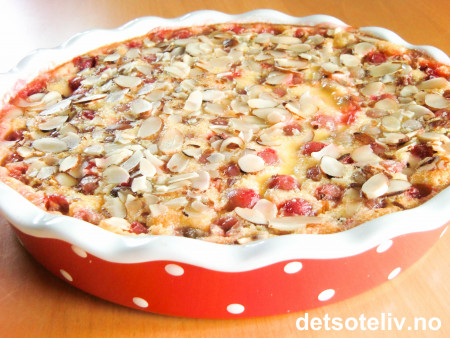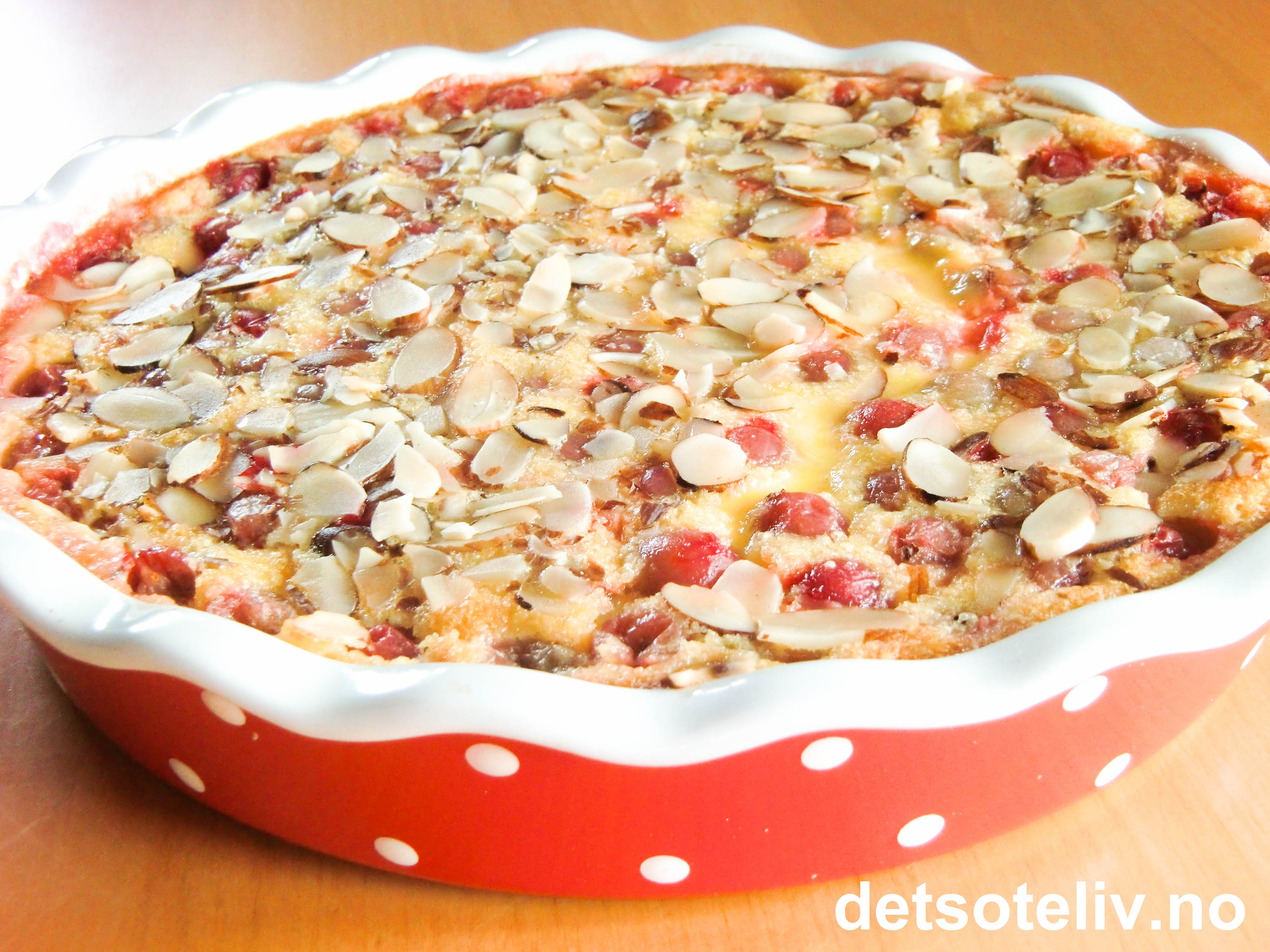 Her har du en stikkelsbærvariant av den kjente, franske dessertkaken "Clafoutis". Dette er en kake som i grunnen ligner mest på en dessertgrateng, og det mest vanlige er å lage den med kirsebær. "Flaugnarde" brukes ofte som tittel i stedet for "Clafoutis" når man bruker annet enn kirsebær. Jeg har testet kaken både med aprikoser, jordbær og blåbær. Her altså oppskrift på en Flaugnarde des groseilles rouges, som heter "Red Gooseberry Clafoutis" på engelsk, og altså "Clafoutis med stikkelsbær" på norsk. Røde stikkelsbær blir penest og aller best på smak, men du kan bruke grønne stikkelsbær også.