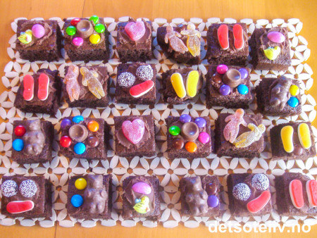 Smelt sjokoladen sammen med smør i en liten kjele. Tilsett cola og melis til en glasur. Avkjøl til glasuren har passe tykkelse. Smør litt sjokoladeglasur på hver kake og pynt frem fantasifulle kakestykker med godteri!