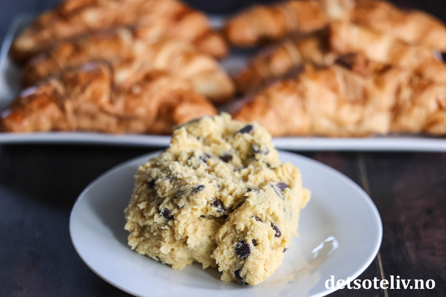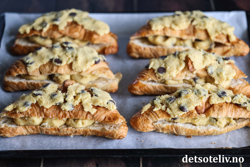 Klem resten av cookiedeigen ut i flak som du legger på toppen av hver croissant og presser lett sammen.
