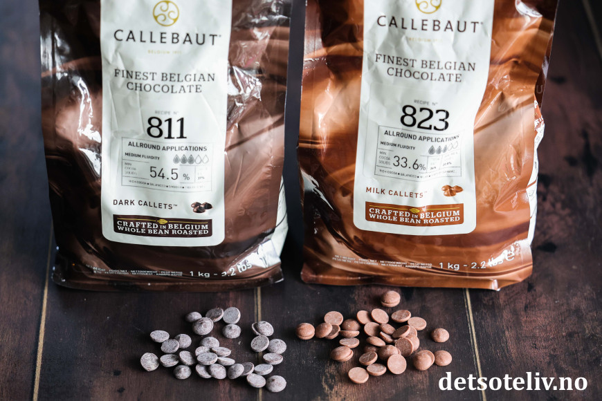 ♥ Jeg har her brukt chocolate chips i mørk sjokolade fra Callebaut i cookiedeigen og melkesjokolade fra Callebaut oppå. Det går veldig fint med andre merker, og grovt hakket kokesjokolade går også fint å bruke.
