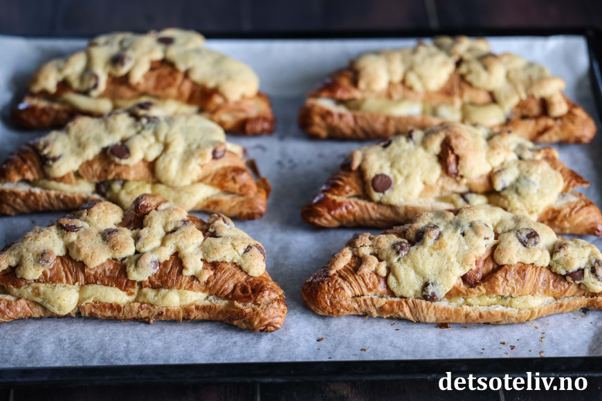 Stek croissantene midt i ovnen ved 200 °C i ca. 10 - 15 minutter. Cookiedeigen oppå croissantene skal ha fått litt farge når croissantene er ferdig stekt, men det er viktig at cookiedeigen inni croissanten forblir bløt og yummy, så ikke stek dem for lenge.