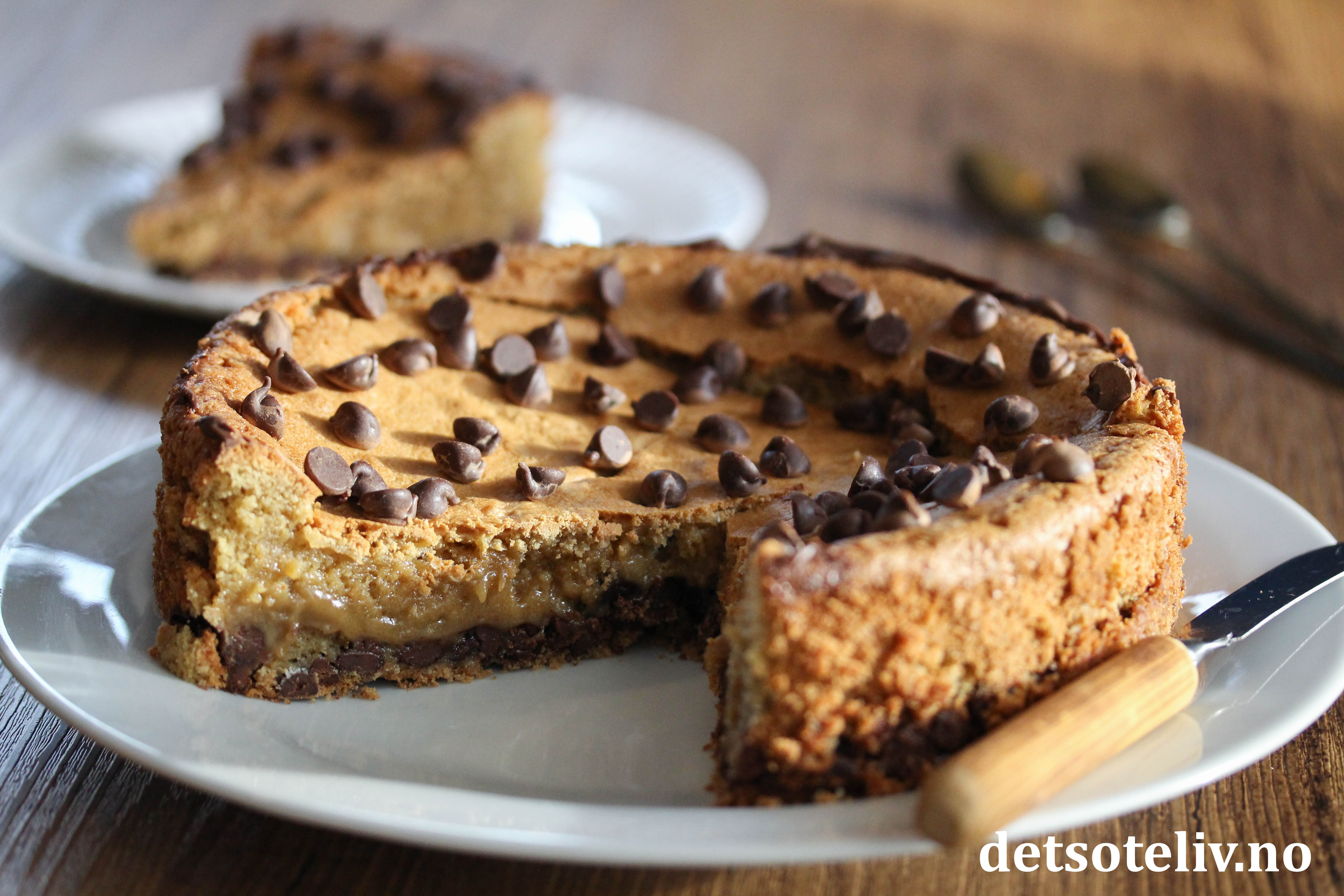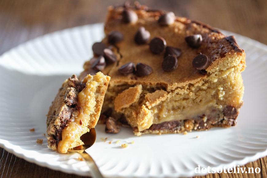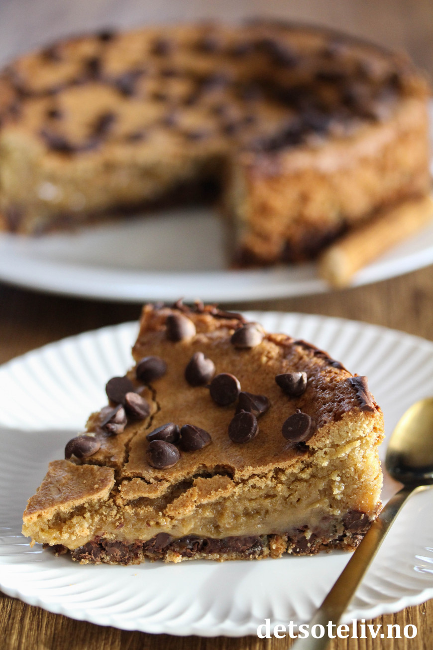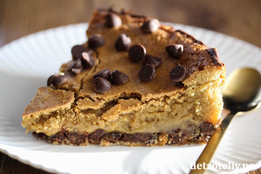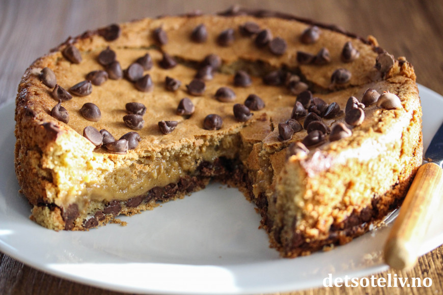 Min samling av digge kladdkaker finner du HER. Dette er en ny, herlig kladdkake, som smaker som halvstekt chocholate chip cookies-deig.