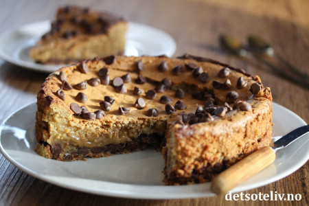 Hell deigen i en rund form (24 cm i diameter) med bakepapir i bunnen. Dryss resten av sjokoladebitene oppå deigen.