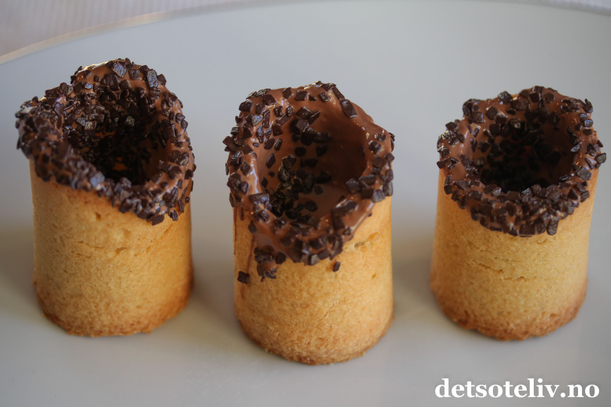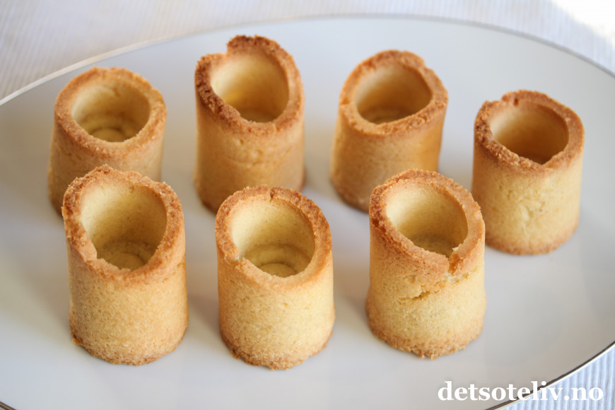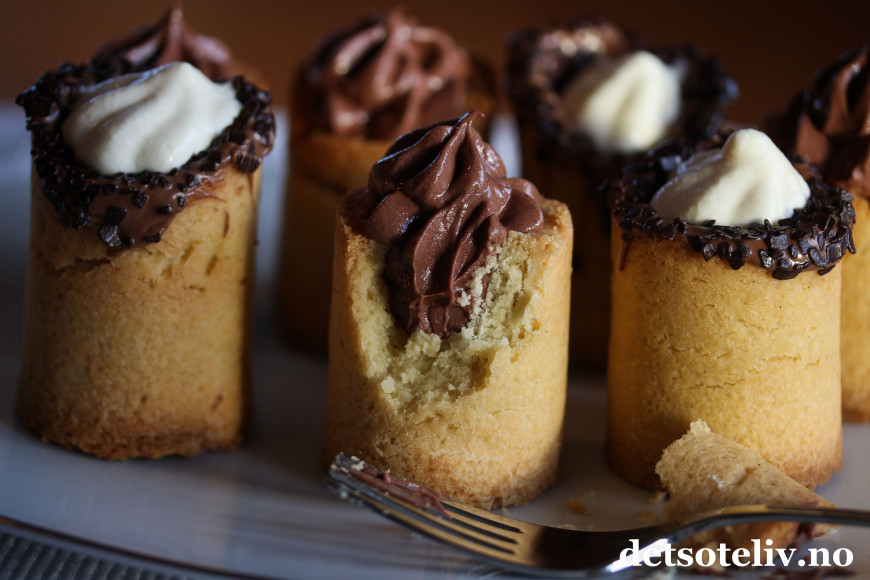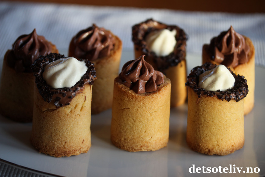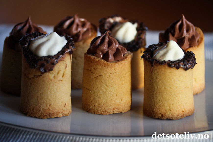 Formene gjør at man kan lage mørdeigskaker som kan fylles, og jeg har her fylt mine med sjokolademousse og krem.