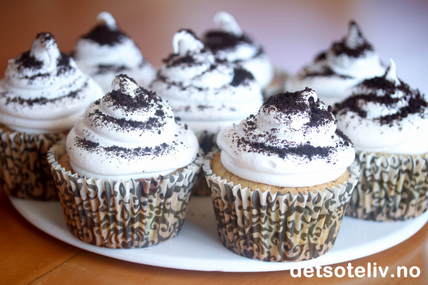 Se også oppskrift på "Oreo Cupcakes" som ligner disse, men som er dekket med en kremostbasert frosting i stedet for marengskrem.