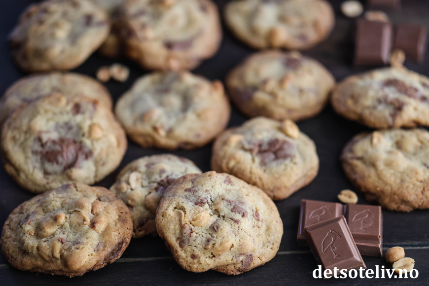 Cookiesene kan også lages med hakkede peanøtter. Da får kakene en litt finere konsistens.