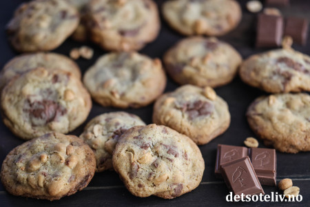 Pisk romtemperert smør sammen med sukker og brunt sukker. Pisk inn vaniljeekstrakt og eggene, ett om gangen. Bland så i natron og hvetemelet til du får en jevn deig. Ha til slutt i grovt hakket melkesjokolade og hele peanøtter (se tips). Sett deigen eventuelt en stund i kjøleskapet dersom den virker veldig myk.