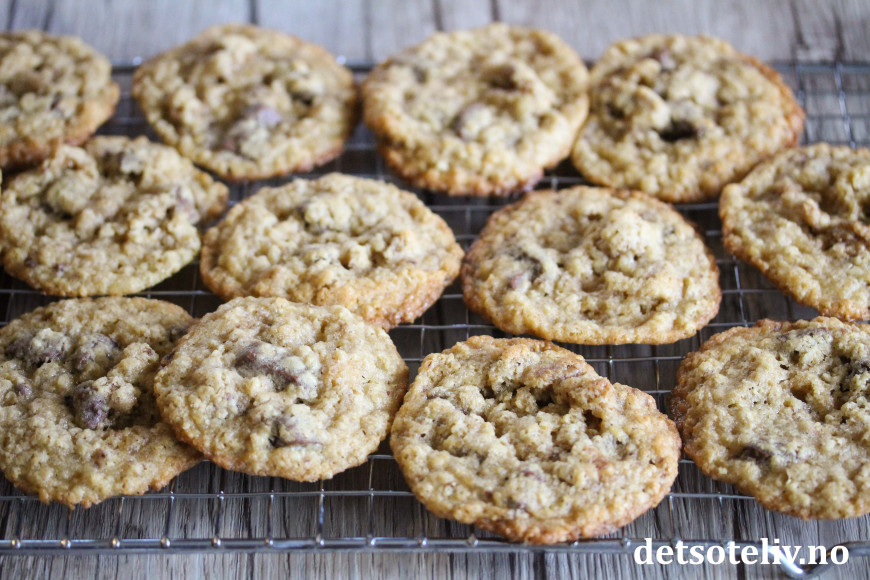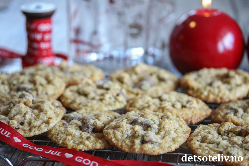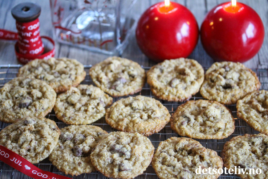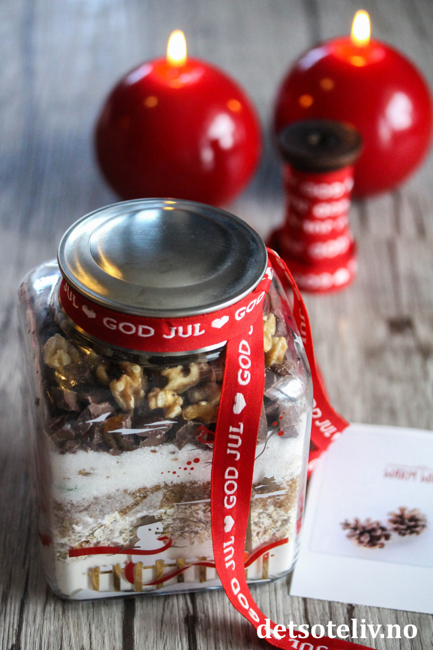Man kan lage denne type gaver med alle typer cookiesoppskrifter, så bruk din favoritt! Denne oppskriften gir deilige Havrecookies med sjokolade og valnøtter.