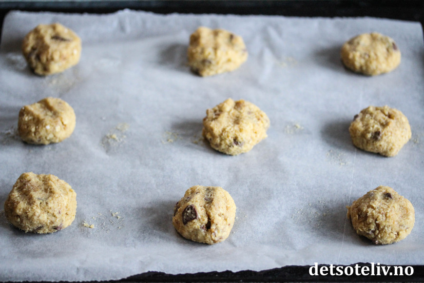 Form deigen til 30 runde kuler som legges på bakepapirdekkede stekeplater med god avstand imellom.