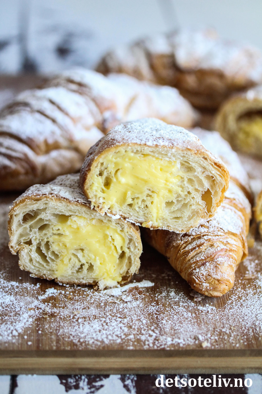 ♥ Jeg synes det går lettest å fylle vaniljekremen i croissantene med en kakesprøyte, men det går også å fylle dem med en spiseskje.