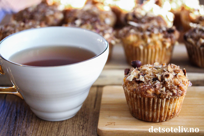 Hakk hasselnøttene fint og bland med brunt sukker og kanel. Fordel toppingen på toppen av muffinsene.