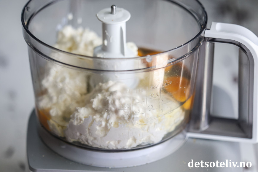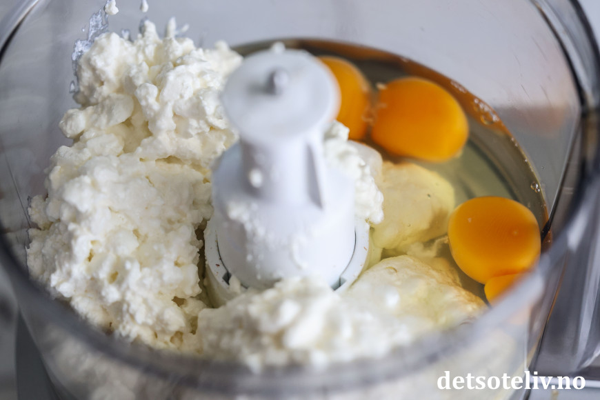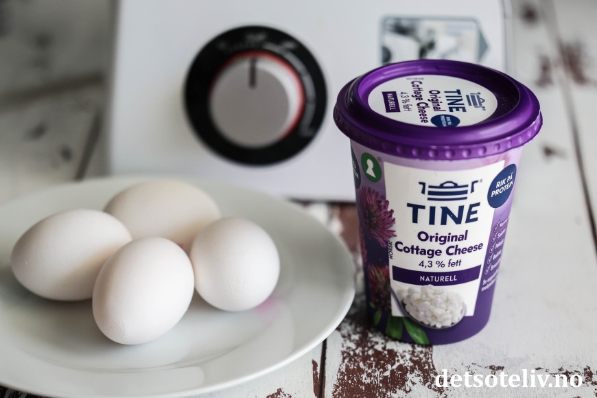 Ha cottage cheese, eggene og litt salt (og eventuelt annet krydder, se tips) i blenderen. Kjør blandingen sammen til en klumpfri røre.