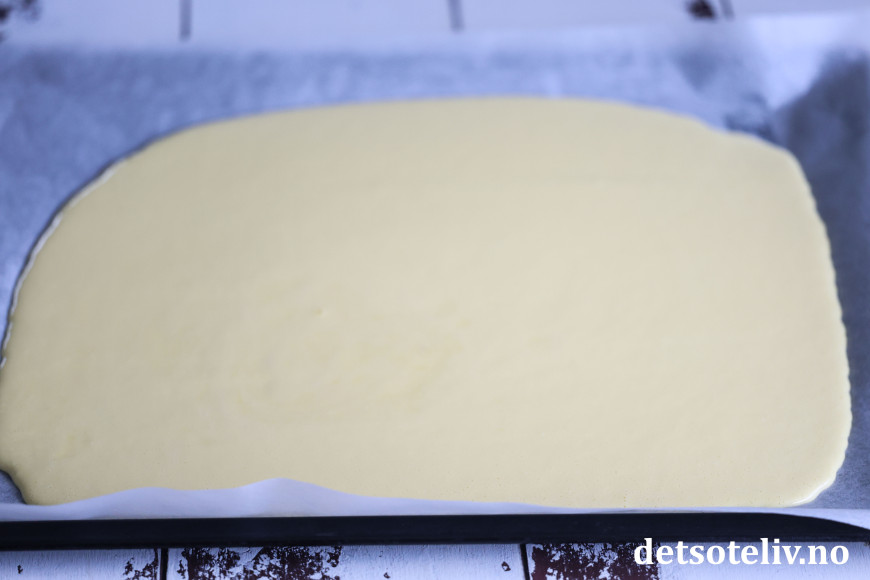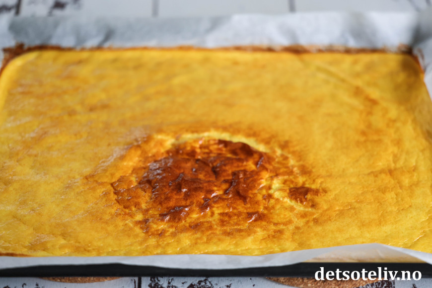 Legg bakepapir i en stor langpanne. Hell cottage cheese-røren i langpannen. Smør røren forsiktig utover slik at den fyller hele langpannen.
