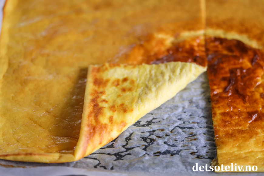 ♥ Det er ikke uvanlig at cottage cheese-røren blåser seg litt opp i langpannen underveis i stekingen. Det er i så fall bare å stikke hull på lefsen med en kakenål eller lignende slik at luften siver ut igjen.