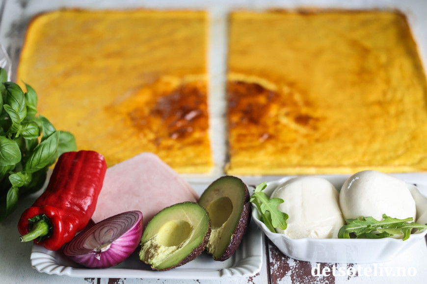 Du kan fylle disse wrapsene med hva du liker. Jeg valgte her kokt skinke, mozzarella og avokado i tillegg til litt ruccola, rødløk, paprika og frisk basilikum.