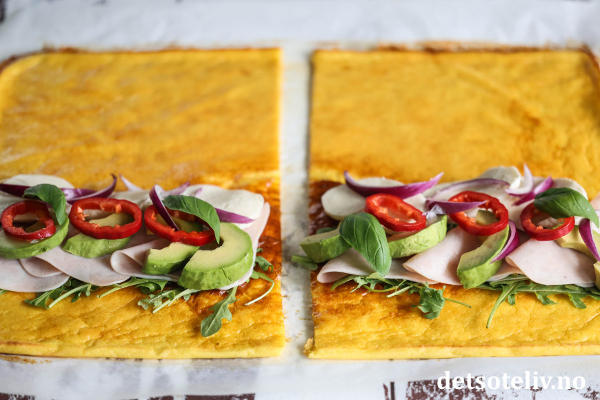 Legg ønsket fyll i en stripe på hver wrap. Jeg brukte her først litt ruccola, noen skiver kokt skinke, fersk mozzarella i skiver, avokado i skiver, noen paprikaringer, tynne strimler rødløk og noen blader basilikum. Kvern eventuelt over litt salt og pepper. Rull deretter stramt sammen.
