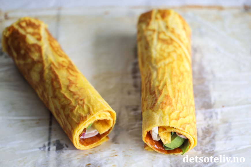 ♥ Jeg brukte det ikke her, men det kan være godt å smøre et tynt lag kremost eller pesto på wrapen før du legger på annet fyll, så blir fyllet i wrapen enda saftigere.