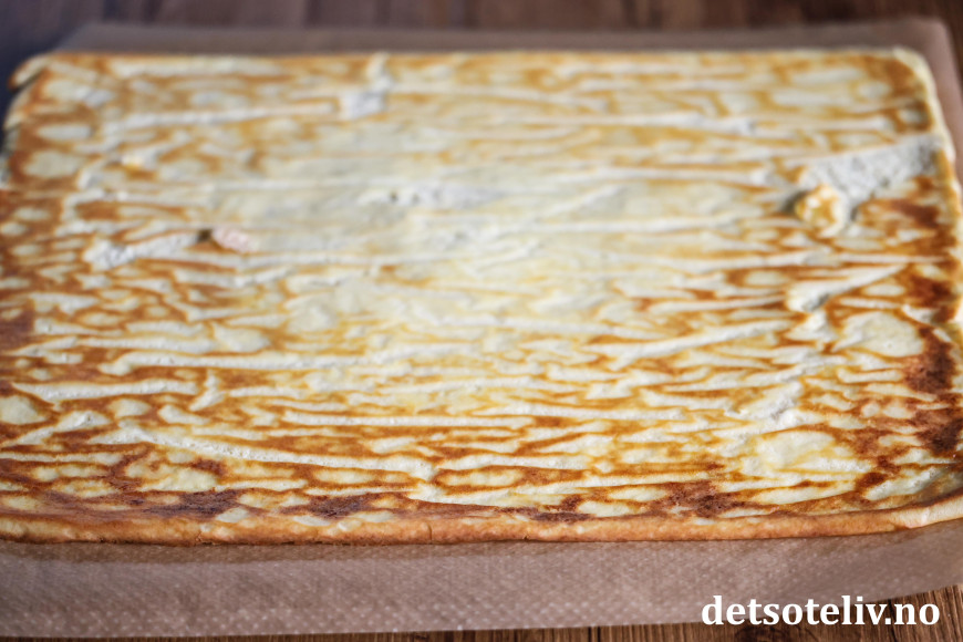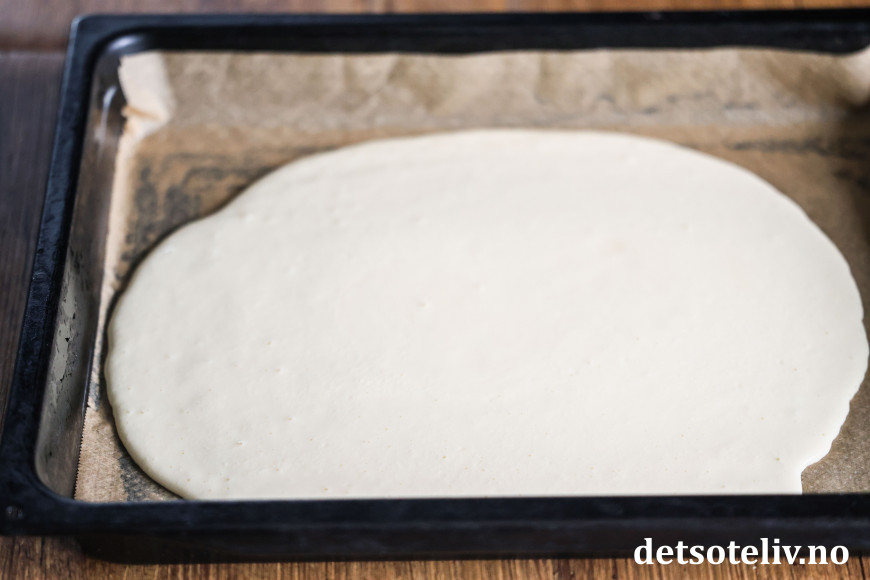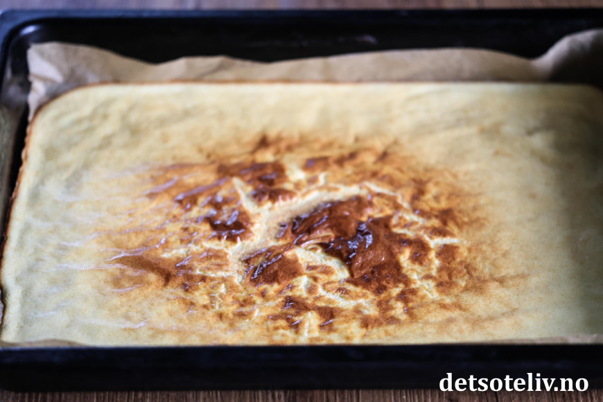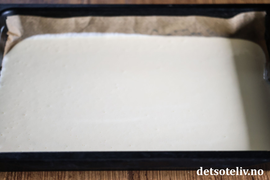 Legg bakepapir i en stor langpanne (ca. 30 x 40 cm). Hell cottage cheese-røren i langpannen. Smør røren forsiktig utover slik at den fyller hele langpannen.