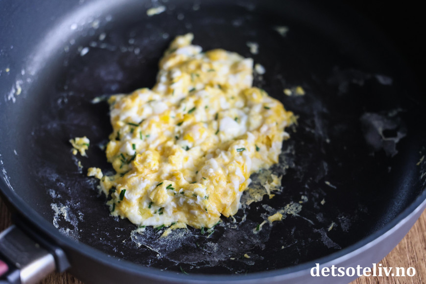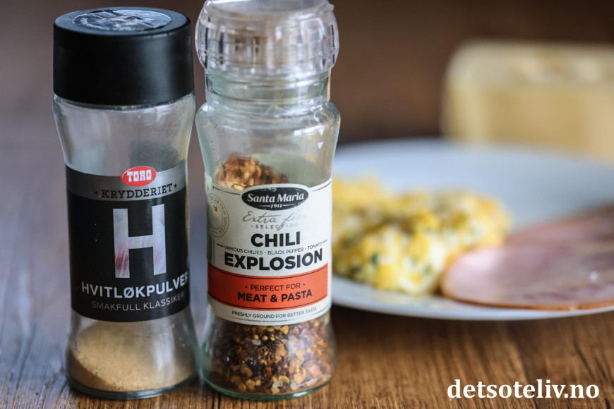 Lag eggerøre av 2 egg og en liten klatt smør. Smak til eggerøren med salt, hvitløkspulver, litt chiliflak og gressløk.