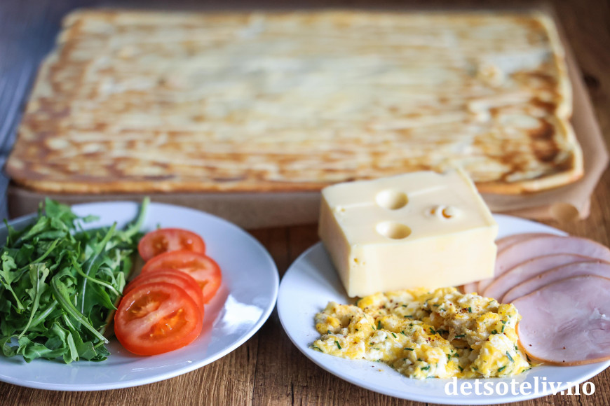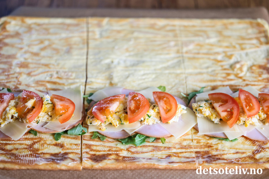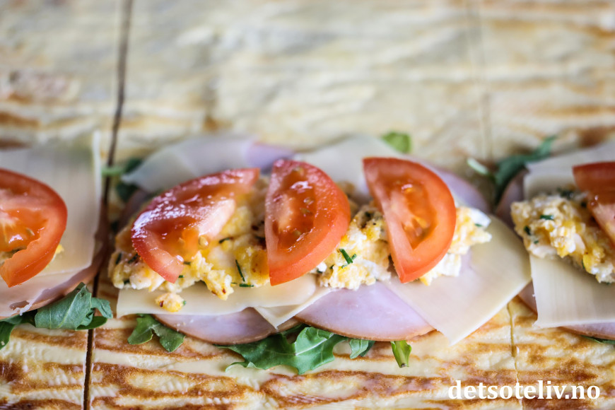 Finn frem de øvrige ingrediensene til fyllet. Smør et tynt lag smør på den stekte cottage cheese-lefsen. Del lefsen i 3 på kortsiden for å lage 3 mellomstore wraps. Legg ønsket fyll i en stripe på hver wrap. Jeg brukte her først litt ruccola, to skiver kokt skinke per stripe og deretter noen skiver ost. Fordel over eggerøren og legg på noen halve tomatskiver.