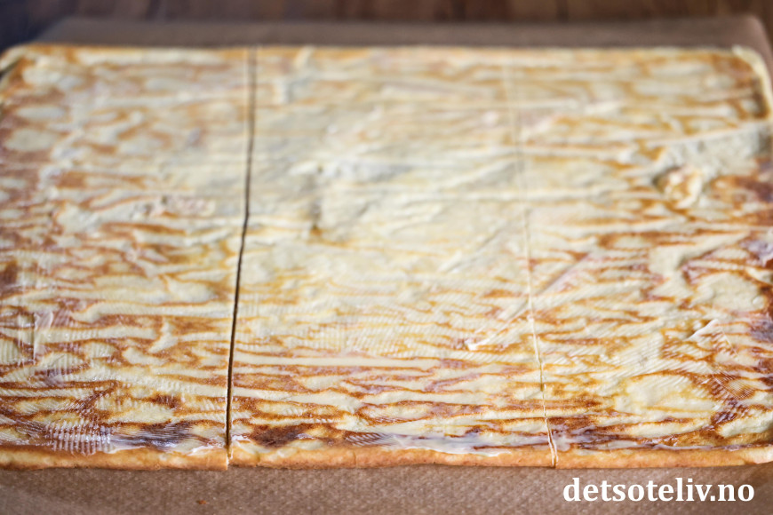 Ta langpannen ut av ovnen og avkjøl i noen minutter. Hvelv ut av pannen og dra forsiktig av bakepapiret.