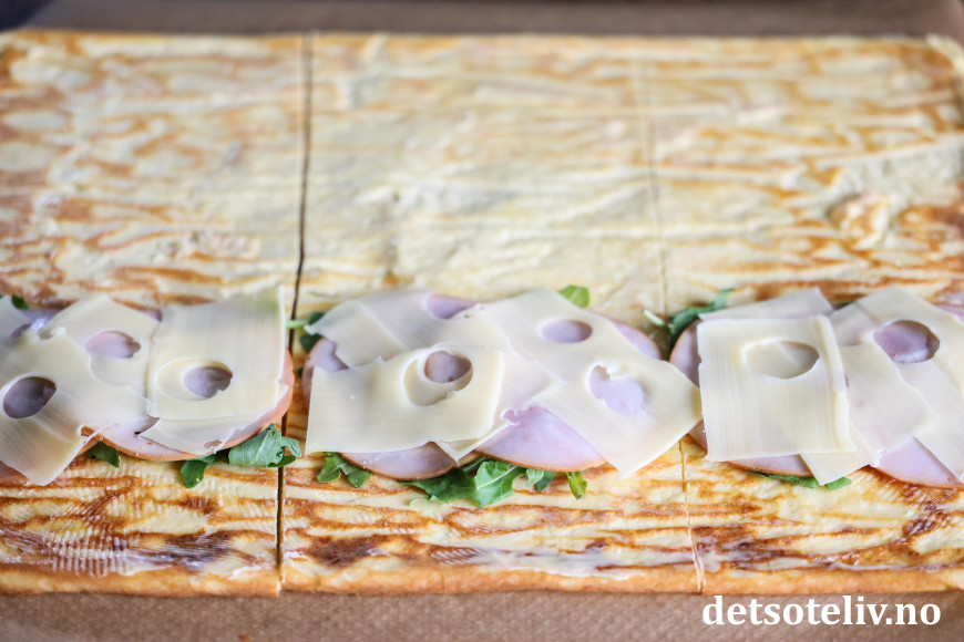 Legg ønsket fyll i en stripe på hver wrap. Jeg brukte her først litt ruccola, to skiver kokt skinke per stripe og deretter noen skiver ost.