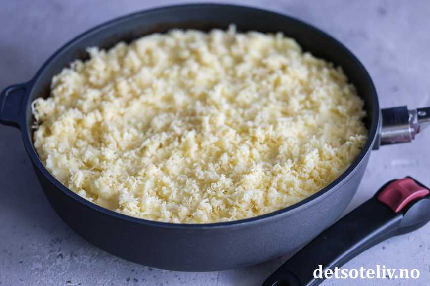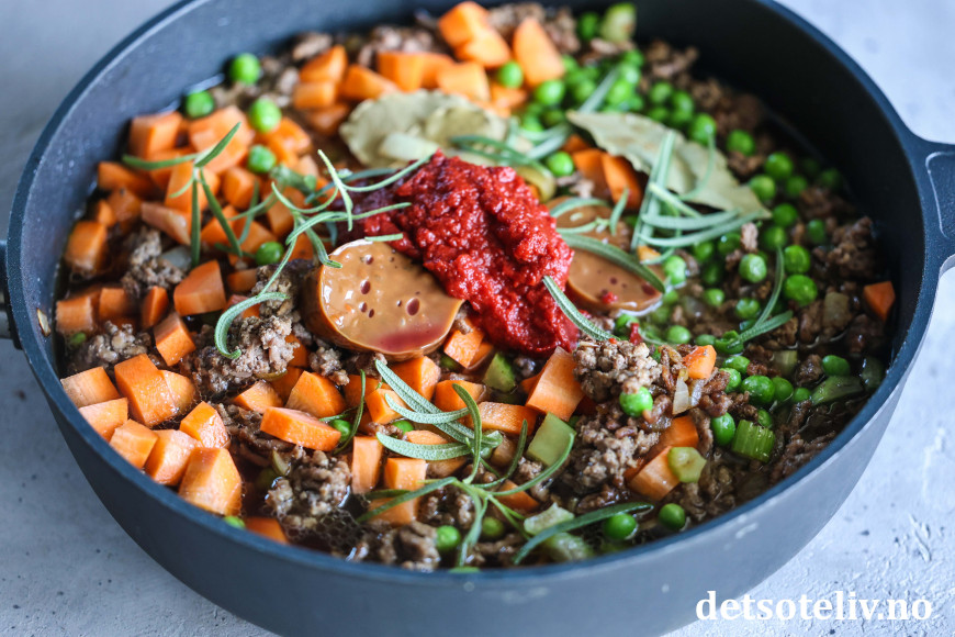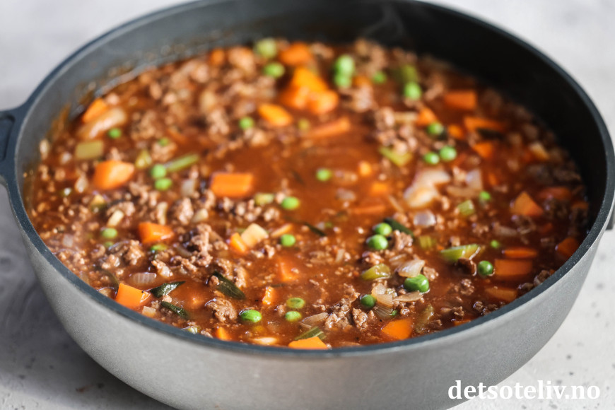 ♥ Jeg har her brukt en stor panne (30 cm i diameter) med nokså høye kanter, som jeg også kan ta av håndtaket på og sette rett inn i stekeovnen. Dersom du ikke har en så stor stekepanne som du kan sette i stekeovnen, kan du lage kjøttsausen i en panne og så helle den over i en ildfast form, før du legger over potetmosen og steker i ovnen.