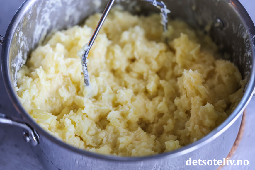 Mos de varme potetbitene med en potetstamper. Ha først i smøret i kjelen, og bruk potetstamperen til å mose smøret jevnt inn i den varme potetmosen ettersom det smelter.