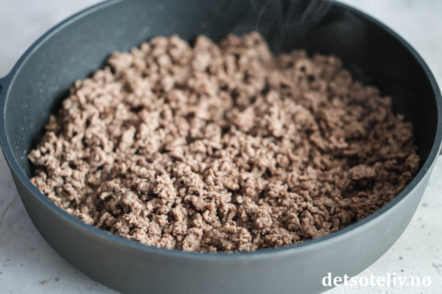Start med å brune kjøttdeigen i et par skjeer olje.