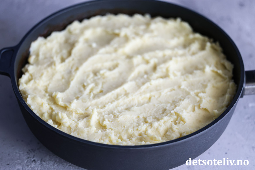 Legg den hjemmelagde potetmosen i et tykt lag oppå kjøttsausen.