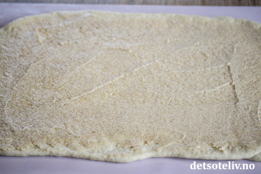 Når deigen er ferdig hevet, kjevles den ut til et stort rektangel.