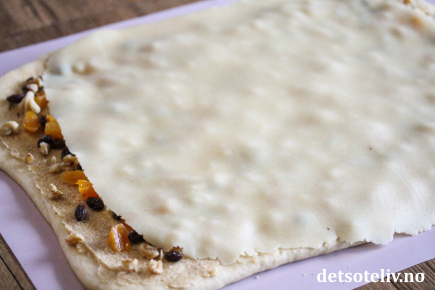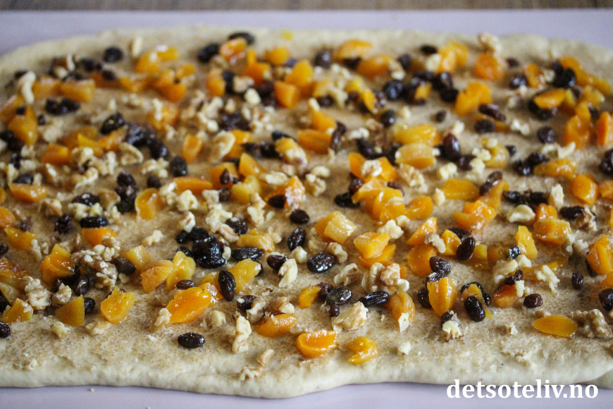 Når deigen er ferdig hevet, kjevles den ut til et stort rektangel. Rør sammen ingrediensene til smørkremfyllet og smør det over leiven. Hell bort overflødig appelsinsaft fra fruktfyllet og fordel aprikoser og rosiner over deigen. Dryss deretter over hakkede valnøtter.