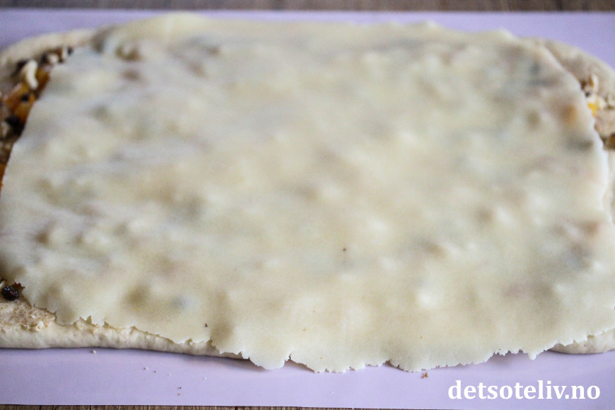 Kjevle ut marsipanen til en firkant som er nesten like stor som deigen. Det er praktisk å bruke en oppklippet plastpose som underlag, for da er det er lett å løfte opp den utkjevlede marsipanen og legge den over deigen. Trykk marsipanen godt ned over fyllet.