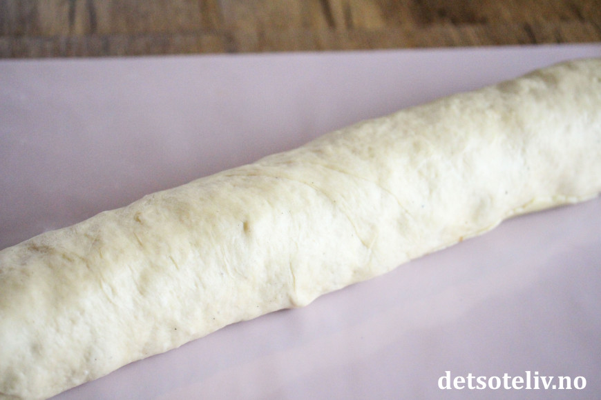 Bruk en brødkniv og skjær forsiktig i rullen på langs slik at den deler seg på midten og du får to lange remser.