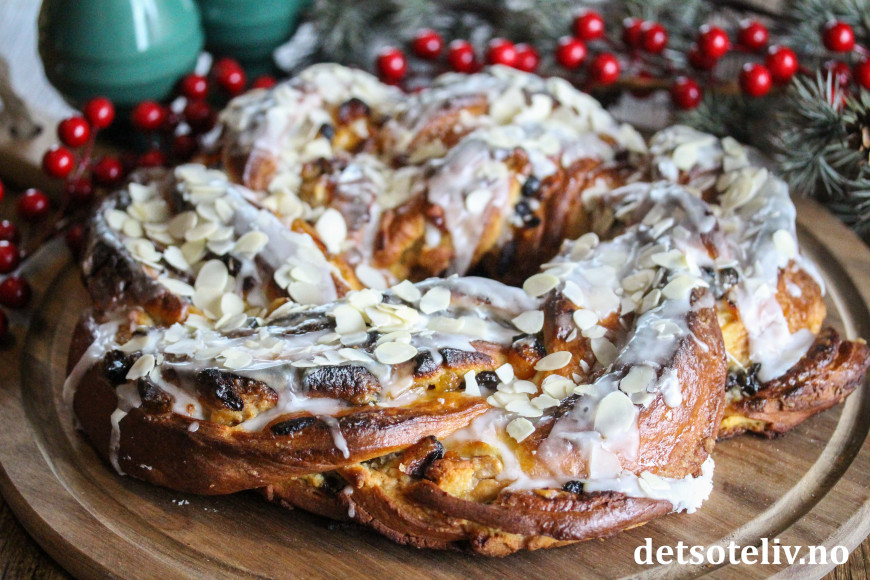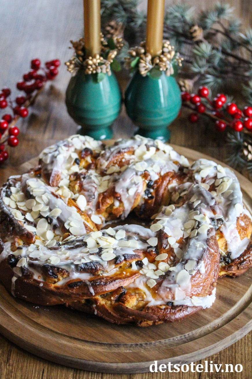 Rull sammen deigen fra langsiden til en fast rull. Bruk en brødkniv og skjær forsiktig i rullen på langs slik at den deler seg på midten og du får to lange remser. Tvinn disse sammen og form lengden til en krans som flyttes over på en bakepapirdekket stekeplate.