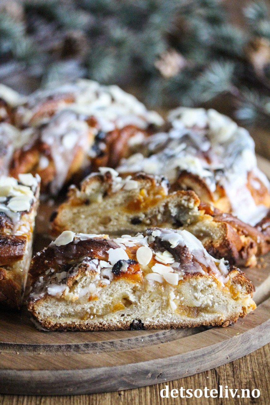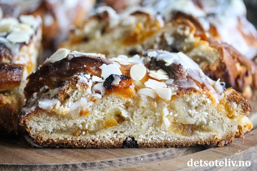 Mens deigen hever, kan du lage klart fruktfyllet. Skjær aprikosene i mindre biter og ha dem i en liten kjele sammen med rosiner, revet appelsinskall og appelsinsaft. Gi blandingen et raskt oppkok. Ta kjelen av platen og la frukten svelle og trekke til seg juicen.