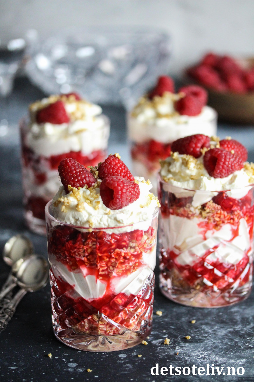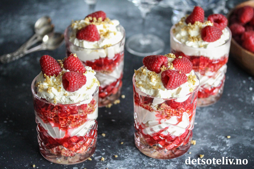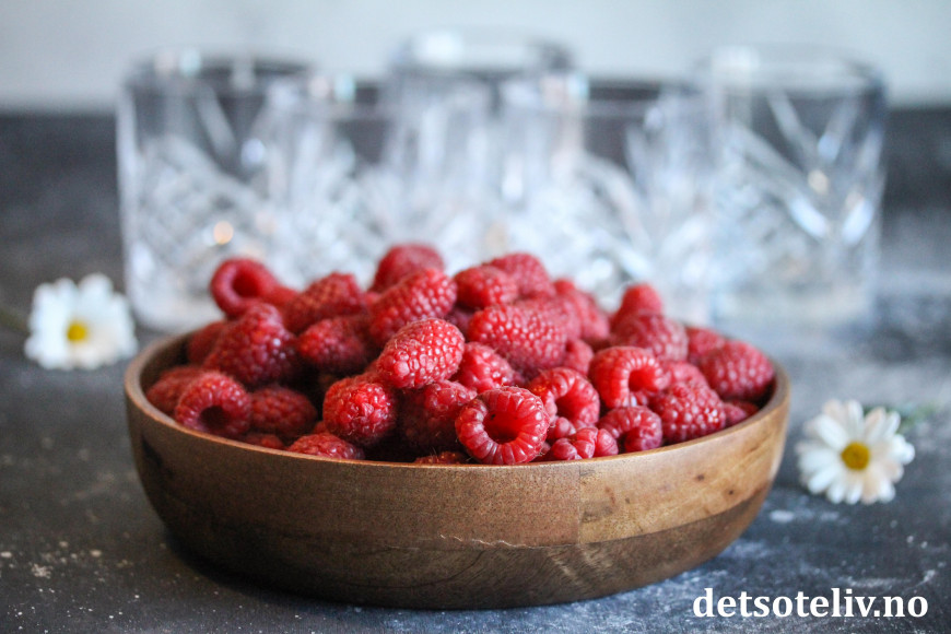 ♥ Desserten blir aller best med friske bringebær, men tinte bær som har vært frosne kan også brukes.