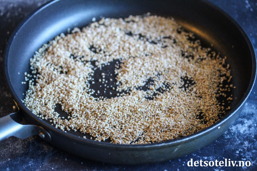 Ha 1 dl av havren i en tørr stekepanne. Rist havren lett i noen minutter for å få frem aromaen.