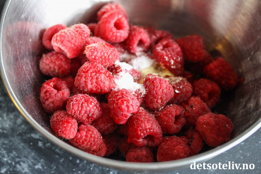 Bruk gaffel eller potetstamper og mos bærene bare lett sammen, slik at du bevarer noen hele bringebærbiter.