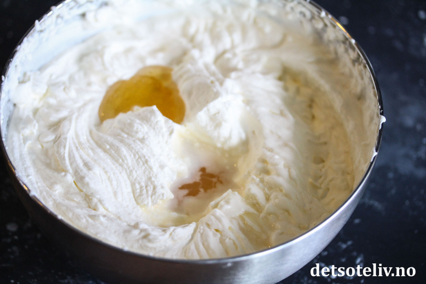 Pisk kremfløten til myk krem. Vend inn flytende honning og whisky.