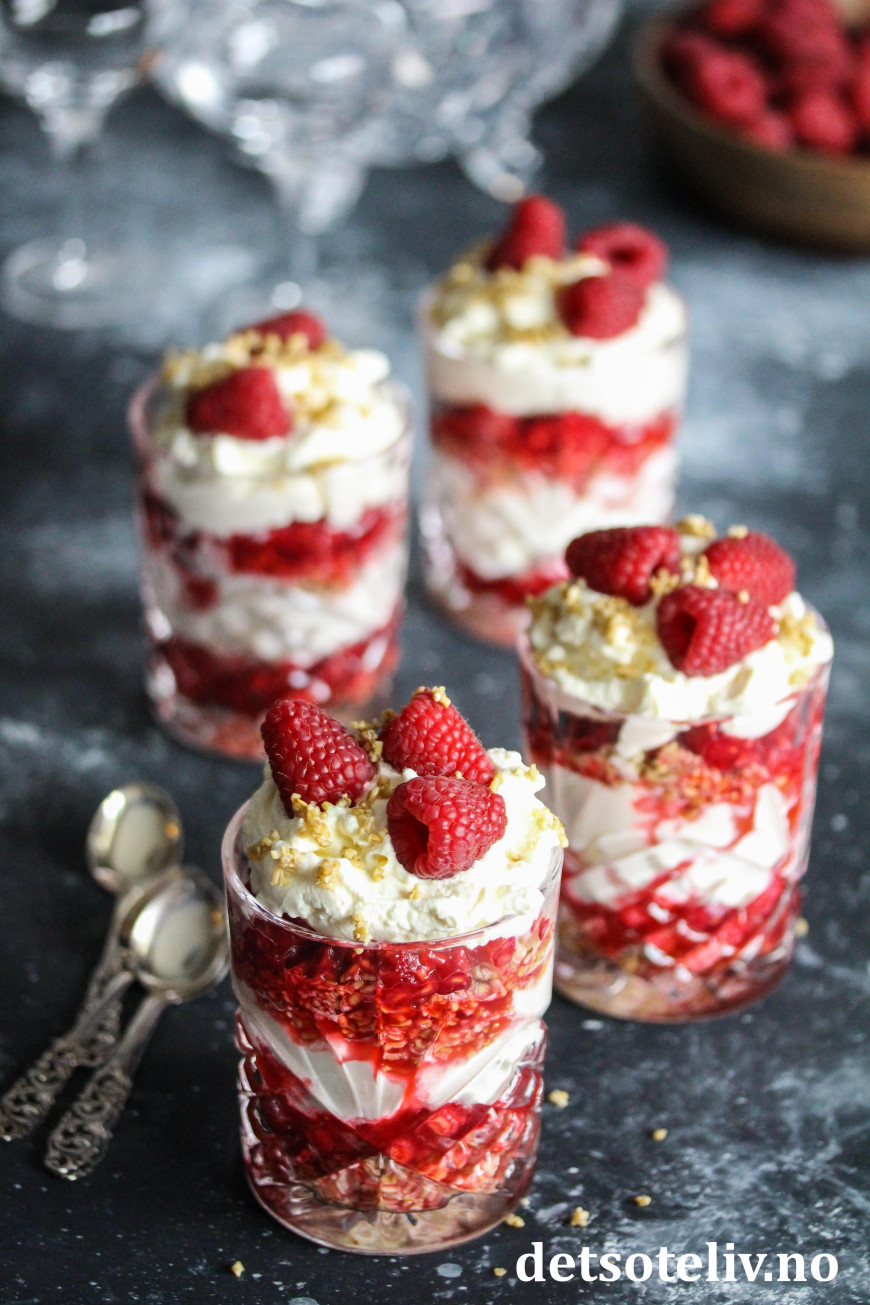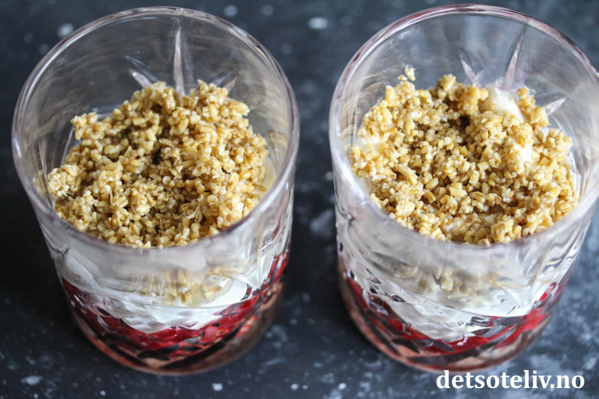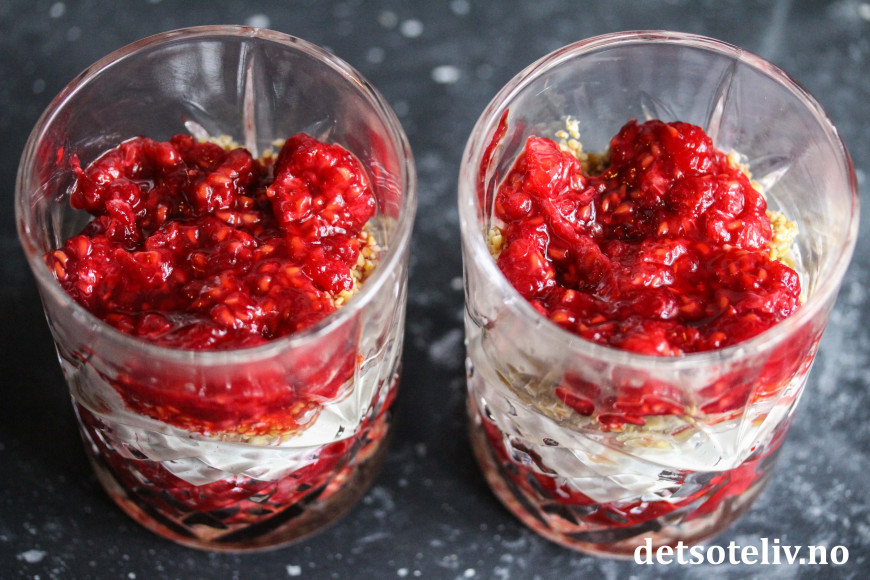Så settes desserten sammen ved å ha havresmuler, bringebærmos og krem lagvis i dessertglass.