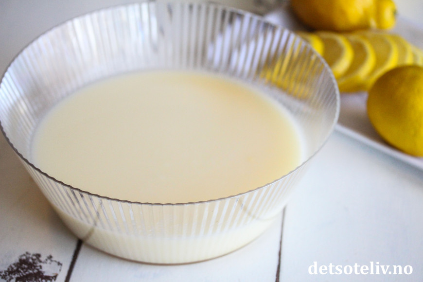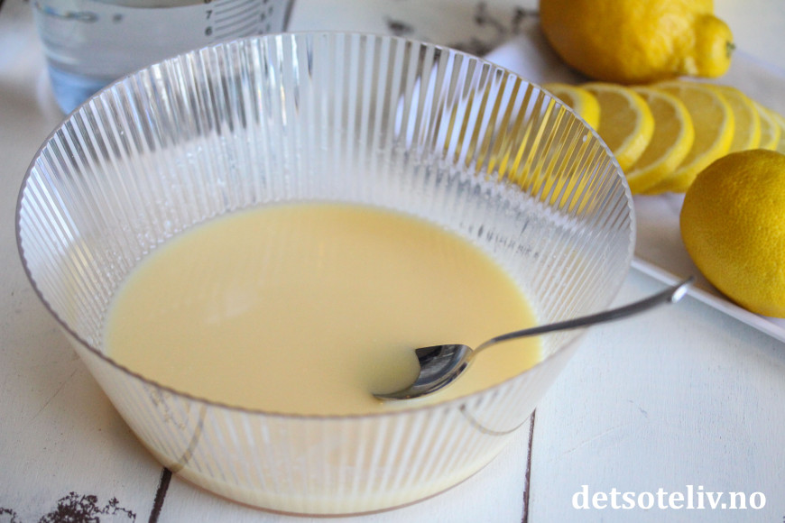 Bland først sukkeret med den kondenserte melken. Tilsett deretter sitronsaft, litt om gangen mens du rører, slik at den kondenserte melken gradvis tynnes ut av sitronsaften.